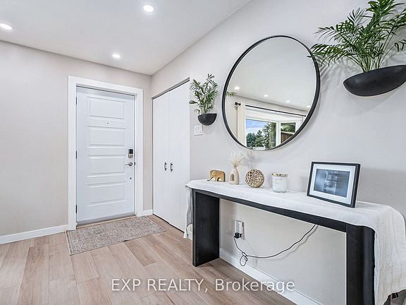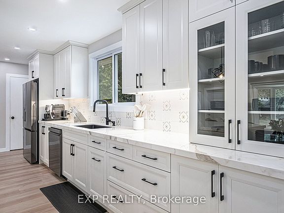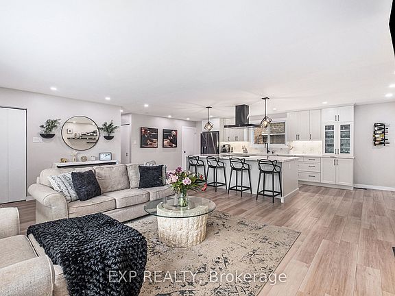 This beautifully renovated 3-bedroom, 2-bath bungalow has seen roughly $250,000 in updates, combining luxury, style, and functionality. The living room showcases a natural almond trail stone wood-burning fireplace and waterproof, scratch-resistant vinyl floors. Smart voice-controlled lighting upstairs and downstairs can change colors, creating the perfect ambiance. The Thomasville kitchen (2024) features soft-close drawers and cabinets, Dekton countertops, a 10x4 ft island, matte black fixtures, a large black sink, European tile backsplash, and premium LG appliances with a chefs hood fan. Off the kitchen, a 4 season sunroom with heated floors, wood-burning masonry fireplace, built-in heater, and 2x2 ft European tiles provides year-round comfort. The upstairs bath includes a modern walk-in shower, maple vanity with quartz countertop, Rubi faucets, and an LED mirror, while bedrooms offer LED ceiling fans and a his-and-hers walk-in closet. The basement is fully finished with a built-in bar, brick wall wood-burning fireplace, gym or storage room, and a spa-like bathroom (2020) with new plumbing, Tenzo faucets, quartz vanity, walk-in shower, Large Freestanding Neptune bathtub, European tile, and LED mirror. Major systems include a gas furnace (2020), new ductwork, A/C (2020), and owned hot water tank (2024). Outdoors, the private fenced yard is a retreat with natural stone walkways, seating area, pergola, Canadian luxury spa Jacuzzi with speakers and lights, and a pull-down projector screen perfect for movie nights. Architectural pot lights illuminate the brick exterior, holiday lighting adds charm, and the front interlock (2024) leads to parking for four cars plus garage. Triple-pane windows and new sliding doors provide excellent insulation. Nothing is rented, everything is owned. Located in a family-friendly Nepean neighbourhood close to parks, schools, shopping, and downtown Ottawa, this home blends high-end finishes and thoughtful upgrades, ready for move-in.