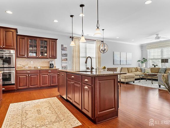 Showings Begin 2/14/25: Your dream home awaits you at Four Seasons @ Manalapan. This elegant ranch-style home offers easy, one-level living with two bedrooms, two full baths, and a versatile den/office. As you arrive, a beautiful stone walkway leads to a charming covered porch, setting the tone for what's inside. Wow comes to mind as you step through the front door and experience a bright, open layout with soaring ceilings, filled with natural light from large windows and enhanced by recessed lighting. The gourmet kitchen is a chef's dream, featuring 42'' cabinetry, granite countertops, stainless steel appliances, a double oven, and a center island with a breakfast bar and stylish pendant lighting. A tumbled marble backsplash adds a timeless touch. Host memorable dinners in the formal More... dining room, where decorative box trim, crown molding, and a tray ceiling bring a sophisticated ambiance. Relax in the cozy living room with gleaming hardwood floors and a warm gas fireplace, or unwind in the luxurious primary suite, complete with a tray ceiling, walk-in closet, and spa-like bath. Step outside to an expansive paver patio perfect for entertaining, BBQs, or quiet mornings. Two large retractable awnings provide extra shade for added comfort. An attic with open stairway for storage above the 2 car garage offers plenty of room for all your essentials. As a bonus, this home includes a one-year home warranty! Nestled in the heart of Monmouth County, this home provides easy access to major roads, shopping, dining and nearby transportation to NYC. Plus, with resort-style amenities and a vibrant clubhouse lifestyle, there's something for everyone: a quiet escape to the library, an event in the banquet hall, or a competitive game of pool, tennis, pickleball, or cards, and more. Stay fit all year round with use of the indoor and outdoor pools, plus a fully equipped gym with cardio and weights. At Four Seasons @ Manalapan, you'll live like you're on vacation--every single day!
