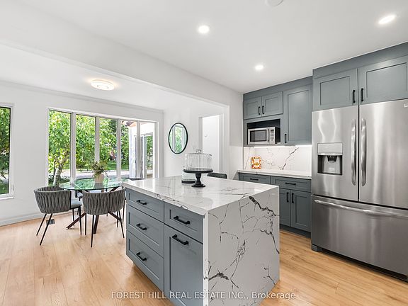 Mature treesNew wood deckSoaring two-storey vaulted ceilingsLarge windowsRenovated eat-in kitchenQuartz countersWaterfall island