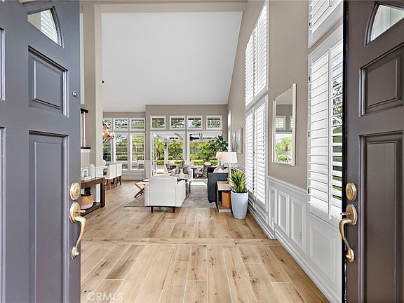 OKAY!! THIS IS THE ONE YOU'VE BEEN WAITING FOR!! THIS HAS IT ALL!! Tucked away at the end of a peaceful CUL-DE-SAC on an EXPANSIVE 9,194 SF LOT, this exceptional home offers a rare blend of luxury, space, and panoramic views—including a sliver of the ocean. The outdoor setting is nothing short of spectacular, with a sparkling pool, beautifully landscaped gardens, and a large grassy area perfect for play or relaxation. An Elitewood patio cover provides shade and style for outdoor gatherings, while the built-in DCS barbecue grill makes entertaining a breeze. Whether you're hosting summer parties or enjoying quiet evenings in the yard, this backyard oasis is designed to impress. Inside, the 3,046 square foot floor plan is filled with thoughtful upgrades and elegant finishes. The main level boasts soaring vaulted ceilings, brand-new porcelain tile flooring, custom wainscoting, Plantation Shutters, and built-in cabinetry framing the fireplace and a built in buffet adjacent to the dining room. A stunning kitchen makeover includes a quartzite island, Thermador cooktop, Kitchenaid double ovens and dishwasher, and a built-in microwave—blending beauty and function for the home chef with plentiful white cabinetry. Modern touches like new LED can lights and stylish chandeliers bring warmth and sophistication to every room. Additional features include a full home repipe, new furnace, tankless water heater, whole-house fan, and dual air conditioning systems for year-round comfort. The home offers a flexible and functional layout with a large bedroom & full bath on the first floor—ideal for guests or multi-generational living. Upstairs, the spacious primary suite is accompanied by two additional bedrooms that share access to a private covered balcony with a beautiful view of Saddleback Mountain. A secondary bathroom with dual sinks serves the upper level, while a large loft provides a versatile bonus area with built-in desks, a TV armoire, and room to relax, study, or play. Located in a vibrant, amenity-rich community, residents enjoy access to a community pool and a variety of neighborhood activities. The home’s ideal location is walking distance to top-rated Arroyo Vista K-8, combined with the stunning views, large lot, and carefully curated upgrades, make this a truly one-of-a-kind opportunity to own a dream home in a breathtaking setting.