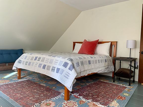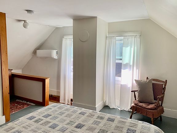 Enter through french-style doors to charming, window-filled kitchen and living, bath and washer/dryer rooms on first floor. Bedroom is on second floor. Wide south-facing porch and acres of fields and forest. Duplex. 1 quiet tenant next door.