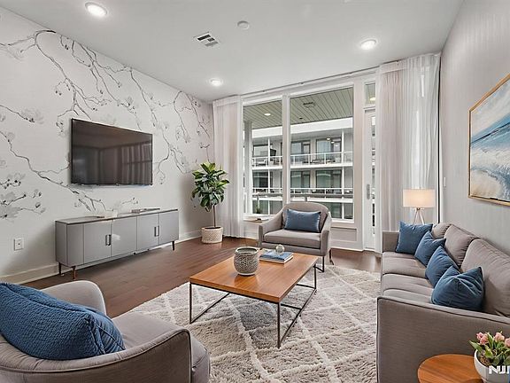Luxury waterfront living at The Glass House in Edgewater. This 1BR + Den, 1BA condo offers 998 sf of open-concept living plus a 225 sf private balcony with Hudson River and Manhattan skyline views. Floor-to-ceiling windows and 10-ft ceilings fill the home with natural light. Features include custom closets, designer Phillip Jeffries wallpaper, a chef's kitchen with Caesarstone countertops, Sub-Zero & Wolf appliances, and a sleek backsplash. Spa-like bath with oversized vanity, modern fixtures, and soaking tub. Versatile den works as office, guest space, or nursery. Smart home features include Nest thermostat and keyless entry. Amenities: rooftop terrace with panoramic NYC views, entertainment lounge, resort-style pool, fitness center, playroom, concierge, package receiving, and on-site management. Includes private parking and storage unit. Pet-friendly with nearby green space and waterfront paths. Easy commute via express bus or ferry with shuttle service. HOA covers water, sewer, trash, and all amenities.