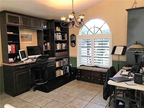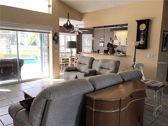 This 3BR/2BA/2car garage heated pool/spa home is designed for easy family living or entertaining. Tiled throughout, this spacious open living room has cathedral ceilings, ceiling fan, & transom window over sliding glass doors that lead to the lanai. The renovated tiled kitchen w/coffee glazed raised panel doors, granite counter tops, stainless steel appliances, pendant lights (2008) all compliment the tiled backsplash. Enjoy weekend brunch at the breakfast bar or cozy breakfast nook. In 2016, custom cabinetry was added to the spacious tiled dining room to create an office for the home entrepreneur. The spacious master bedroom boasts plank tile floors, custom tray ceiling, ceiling fan, walk-in-closet, pocket sliding glass doors to lanai, and a tasteful tiled master bath w/double vanities, dressing table & step in shower. The front guest bedroom offers tiled floor, vaulted ceiling, wall closet, & a ceiling fan. The 3rd bedroom/den/office space has tiled floor, wall closet, ceiling fan, sliding glass doors to lanai, & features double pocket doors to living rm. The large pool area has an extended screened lanai, porch swing, heated pool & spa, and a private seating area off the master suite. Lots of cabinetry in the 2 car garage. Amenities include sprinkler system from canal, whole house generator, hurricane shutters, re-plumbed 2010, tinted windows, new A/C in 2014, roof 2012, pool pump 2013, fridge 2015, garbage disp 2017. BR furniture negotiable/All appliances convey/Gun or security safe.