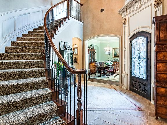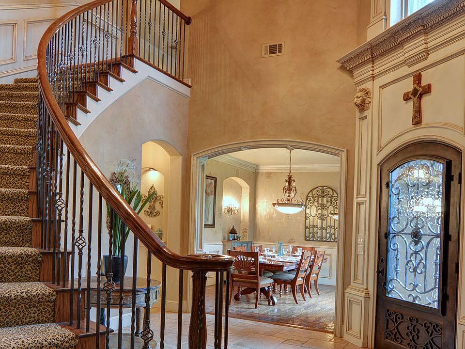 Gated estate home. Courtyard with pool and guest house retreat: wood floors, soaring ceilings, abundance of windows. Main house: Grand foyer. Formal Dining: ornate trim, windows dressed in plantation shutters. Executive study: stained wainscoting with built-ins. Open concept Kitchen-Family RM with stone fireplace, soaring vaulted ceiling embellished in stained beams set aglow with natural light from wall of windows. Kitchen: copper farm sink, prep sink, corbels, top of line appliances. Downstairs media room: fireplace and wet bar. Master Bdrm suite with domed ceiling and spa-like Master Bath: impressive barrel roll ceiling bathtub and walk-through shower. Open and Covered outdoor living includes stone fireplace