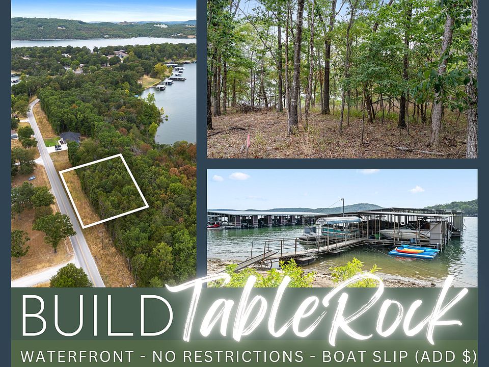 True Walk-to-the-Water Build Site - Table Rock Lake ParadiseDiscover an incredible opportunity to build your lakefront dream--where cool breezes roll off the water, waves gently meet the shore, whippoorwills call in the distance, & fireflies dance along the shoreline at dusk. This true walk-to-the-water lot is a rare find, offering unmatched peace, privacy, & abundant local wildlife--a genuine Ozarks paradise.With no restrictions, you're free to create the custom retreat you've always imagined. Whether it's a cozy cabin or a creative masterpiece, the gently sloping, wooded terrain lays beautifully--ready for you to carve out your perfect nature oasis. Launch a kayak or paddleboard from your backyard for a serene morning excursion, or cast a line from the shoreline steps away from your future deck.Want to complete the ultimate lake-life package? Seller is also offering a coveted 10x26 boat slip (add $65k) in the popular Rice Camp subdivision just minutes away--making it easy to enjoy fishing, skiing, exploring, or coving out for long summer days of fun & cherished memories to come.And the location! By water, you're perched perfectly between Kimberling City & Branson--minutes to boat-up restaurants, summer nights under the SDC fireworks, multiple marinas, the famous ''cliffs'' & ''swings,'' & more. By land, less than 15 minutes to Reeds Spring Schools, Walmart, pharmacies, spas, boutiques, eateries, & only ~30 minutes to Branson for world-class dining, shopping, live entertainment, & hiking/biking in Mark Twain National Forest.Bring your vision & start living the Table Rock Lake lifestyle you've always dreamed of--this one has it all! Waterfront & Water View in the heart of the rolling ozark hills. Home available next door MLS# 60289533 as well as additional land MLS# 60303967