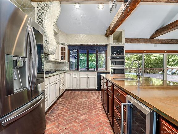 This Mediterranean masterpiece is situated on 3 private acres in one of the more convenient sections of beautiful Easton, CT! Its unique European design style offers a bucolic setting that is second to none! The interior compliments with rustic beams and curved archways throughout much of the main level. The oversized kitchen has plenty of room for a quiet meal around the island or a full family weeknight meal in front of the gorgeous stone fireplace and stove. Easy access to the large deck and pool through the sliders make summer bbq's and get togethers seamless! The formal dining area is large and sits adjacent to a sunken formal living room for holiday feasts and gatherings! The Primary Suite is steps away and features a vaulted ceiling, jacuzzi soaking tub, and access to the bright solarium through lovely French doors. The opposite side of the home has a wonderful family room with vaulted ceilings, a beautiful stained glass window, and access to a private balcony for peaceful afternoons with a book and cup of coffee. Three generously sized secondary bedrooms cap off the main level. Downstairs is a dedicated exercise room with attached sauna as well as a large play/rec area for your enjoyment! Convenient to the Merritt and shopping, this home is truly a diamond in the rough with nearly 4,000 square feet of total living space that offers endless possibilities!
