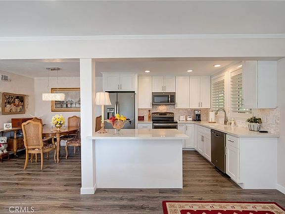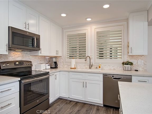 Completely remodeled "Majorca" model. **MODEL PERFECT** Easy access ground level with no steps, close to carport. Located in Laguna Woods community for adults 55+ . Home offers enclosed patio/sunroom to give you an extra square footage and wonderful space to enjoy. Great room/open kitchen concept. Gourmet kitchen complete with large island, new GE stainless steel appliances, quartz counter tops, and soft close drawers on the new white cabinets. Custom tile backsplash. Romantic master suite with enclosed bathroom, and new tub shower combo with custom tile. Expanded custom tiled shower with glass door in secondary bathroom. Large secondary bedroom can be used as an office or bedroom. Guest bathroom with new white cabinets and quartz counters. Home features CENTRAL AIR and heating, scrapped ceilings, recessed lighting, dual pane windows, laminate flooring that look like wood. New paneled doors and new hardware. Custom wood shutters. Washer, dryer, refrigerator included and located inside the unit. Enjoy sunsets off your west facing enclosed sunroom! Resort style living with 7 club houses, 2 golf courses, swimming pools, 2 fitness centers, tennis complex, equestrian center, free transportation and over 250 clubs. 24-hour guard gated community for adults 55+. Located close to freeways, shopping, world class medical facilities and just minutes to Laguna Beach. HOA fee includes; property tax, water & trash, and basic cable.