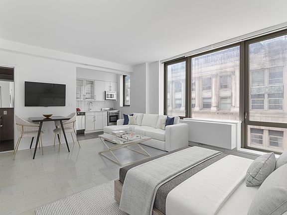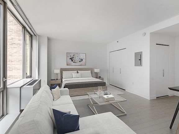 Floor-to-ceiling windowsStainless steel appliancesGenerous closet spaceEmpire state building viewsOak strip flooringQuartz countertopsWindowed kitchen