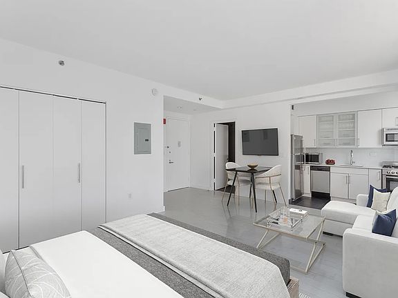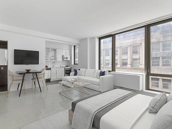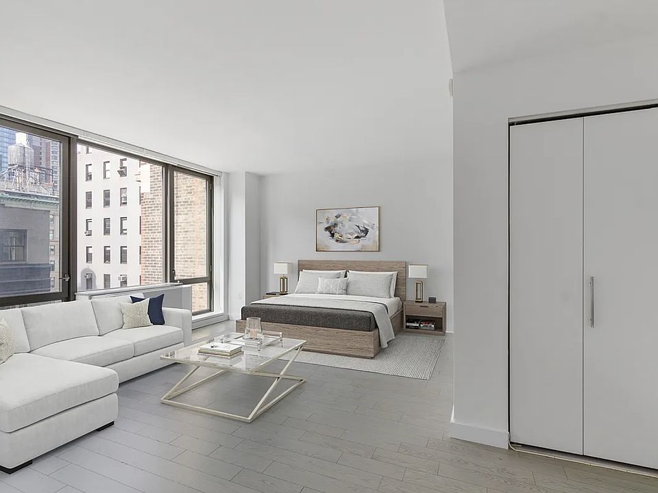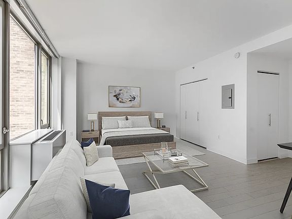 Floor-to-ceiling windowsStainless steel appliancesGenerous closet spaceEmpire state building viewsOak strip flooringQuartz countertopsWindowed kitchen