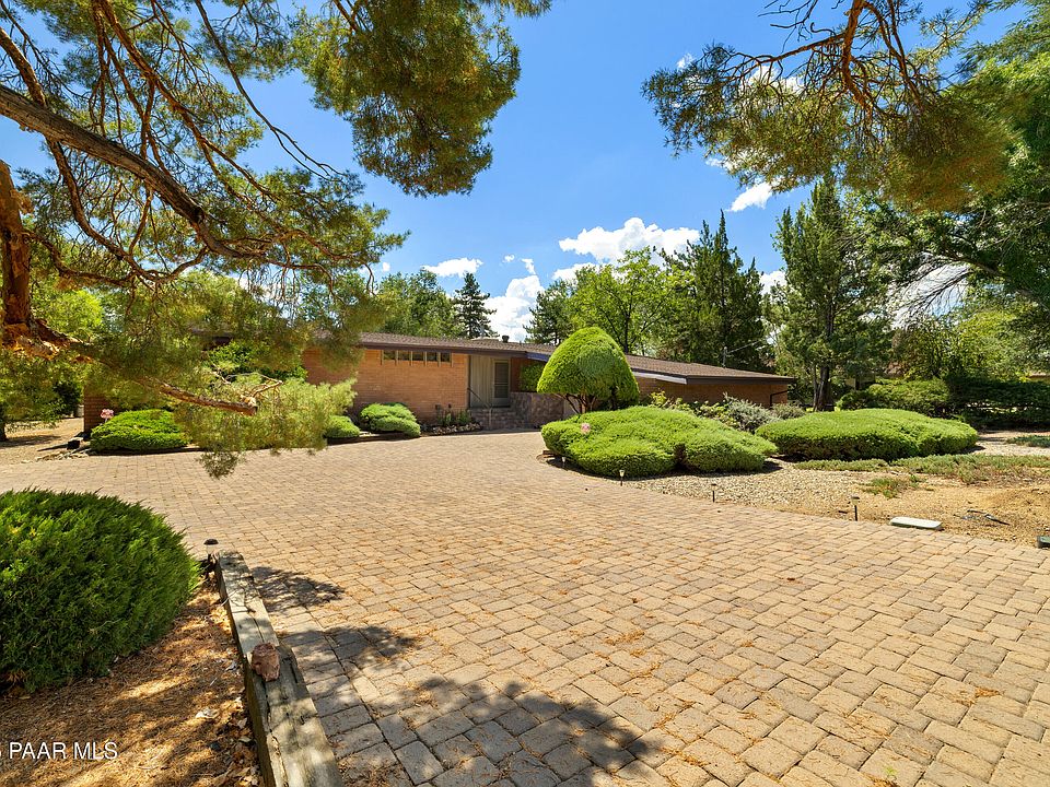 Here is your opportunity to own an amazing affordable home backing a golf course on a HUGE HALF ACRE lot without huge HOA fees!!! This one-of-a-kind Mid-Century Modern home, inspired by the designs of Frank Lloyd Wright, offers 2,229 square feet of elegant, single-level living on a beautifully landscaped half-acre lot--backing the tree-lined Antelope Hills Golf Course. Tucked away on a quiet street, the home combines timeless architectural charm with incredible outdoor living. The expansive yard is a true highlight, offering endless opportunities: build a guest house, expand the gardens, add a workshop, or create a dream outdoor retreat. Lush, mature landscaping and vibrant flower beds attract an abundance of native birds, making this a true paradise for garden lovers and birdwatchers alike. Inside, the home features three generously sized bedrooms, each with its own newly remodeled private bathroom. Two of the bathrooms have luxurious heated flooring- a spa like feature that you'll appreciate year-round. The large primary suite is a true retreat, offering two walk-in closets. The interior layout includes a large living room and a cozy family room, both connected by a stunning dual-sided gas fireplace that adds warmth and ambiance to the heart of the home. The bright and spacious kitchen showcases rich alder cabinetry and ample counter space--perfect for cooking, entertaining, or simply enjoying views of the peaceful outdoor setting.Roof, fascia, and gutters new in (2022), ensuring peace of mind for years to come. A spacious brick paver driveway, mature trees, and colorful gardens complete this remarkable property. Set in a quiet and welcoming neighborhood, this home is ideal for golfers, pilots, nature lovers, or anyone seeking tranquility, beauty, and room to grow in a prime Prescott location.