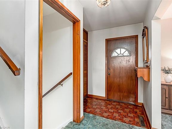 Opportunity knocks with this 3-bedroom, 2-bath side-split set on a 108’ x 70’ lot in a desirable Brantford location. This home offers incredible potential for renovators, investors, or buyers ready to make it their own in this lovely family neighborhood. The exterior features brick, wood, and vinyl siding, a covered front porch, exterior accent lighting, and a two-car carport with closed-in storage and inside access to the mudroom. A four-car paved driveway provides plenty of parking. Inside, the bright living room boasts a wood-burning fireplace with stone surround, wood mantle, and large picture window. It flows into the dining room with patio doors to the backyard and an eat-in kitchen offering ample cabinetry, counter space, stainless-steel double sink, three appliances including a newer stainless-steel stove, and a walkout to the yard. The separate main floor primary bedroom has his-and-hers closets and a large window overlooking the backyard and is right next to a three piece bath. Two upper-level bedrooms with hardwood flooring share a 4-piece bath. The lower level includes a recreation room, laundry area plus a large crawl space. Surrounded by mature trees, the backyard offers privacy and a patio ready for entertaining. Close to parks, schools, amenities, and with easy access to the 403, this property combines location, space, and convenience.