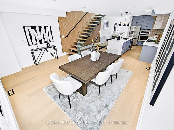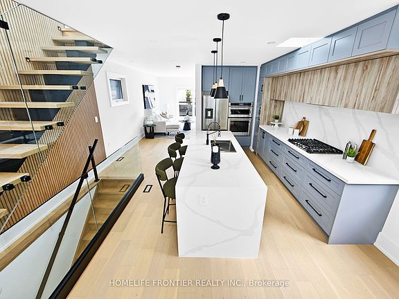Welcome to this stunning custom-built 2-storey detached home in the heart of East York, offering 3+1 spacious bedrooms & 3 spa-inspired bathrooms, meticulously crafted with high-end finishes throughout. The chefs linear kitchen boasts quartz countertops, a 11-ft breakfast bar, custom cabinetry, and top-of-the-line appliances, combining style with function. The expansive living room features an open concept layout with floor-to-ceiling sliding patio doors that fill the space with natural light and extend to a private backyard retreat, perfect for entertaining or quiet relaxation. Architectural highlights include 6 skylights, soaring ceilings, engineered hardwood floors, a glass-encased floating steel staircase, and dramatic floor-to-ceiling windows. The second level offers three generous bedrooms, each with built-in closets, along with a luxurious 5-piece bath and additional skylights that create a bright, airy atmosphere. The legalized lower level 1-bedroom apartment with a separate entrance provides excellent income potential or serves as an upscale in-law suite. Situated within the sought-after RH McGregor School District & close to TTC, Subway Access, & DVP, this home is a rare opportunity that blends modern luxury, unique design, & everyday practicality.