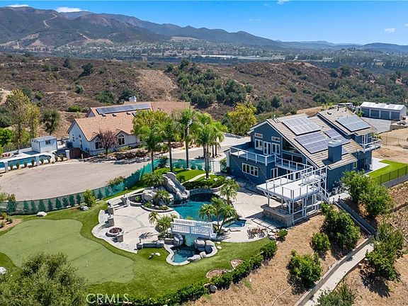 The expansive resort-style backyard, ideal for relaxation and recreation, includes a meandering pool, spa, tropical landscaping, 12 fruit trees, putting green, and synthetic grass. A large fenced grass area is also available on the property for gated RV access. Notable features include seller-owned solar panels, Generac whole house generator, new HVAC and a Quick Tesla Charger. Spanning approximately 2.5 acres, the lower area is dedicated to equestrian activities with a professionally designed horse arena and additional stable facilities, including ample parking. This property offers a perfect blend of country tranquility while remaining conveniently close to urban amenities.