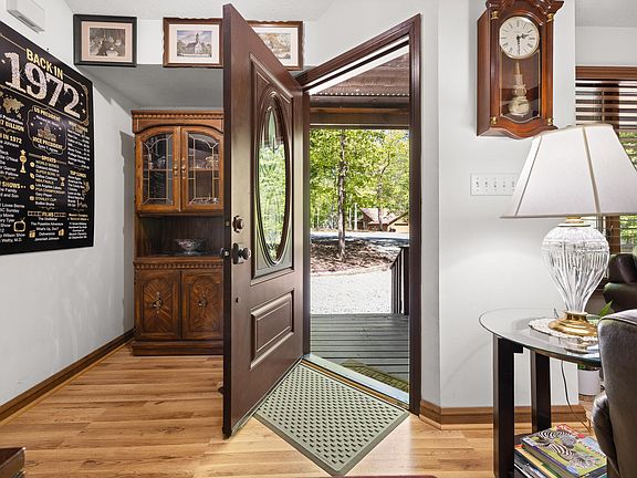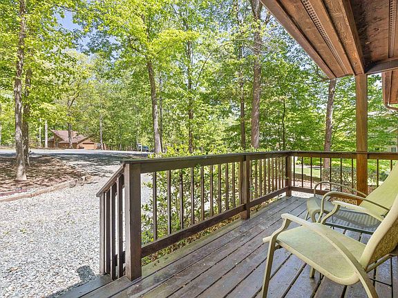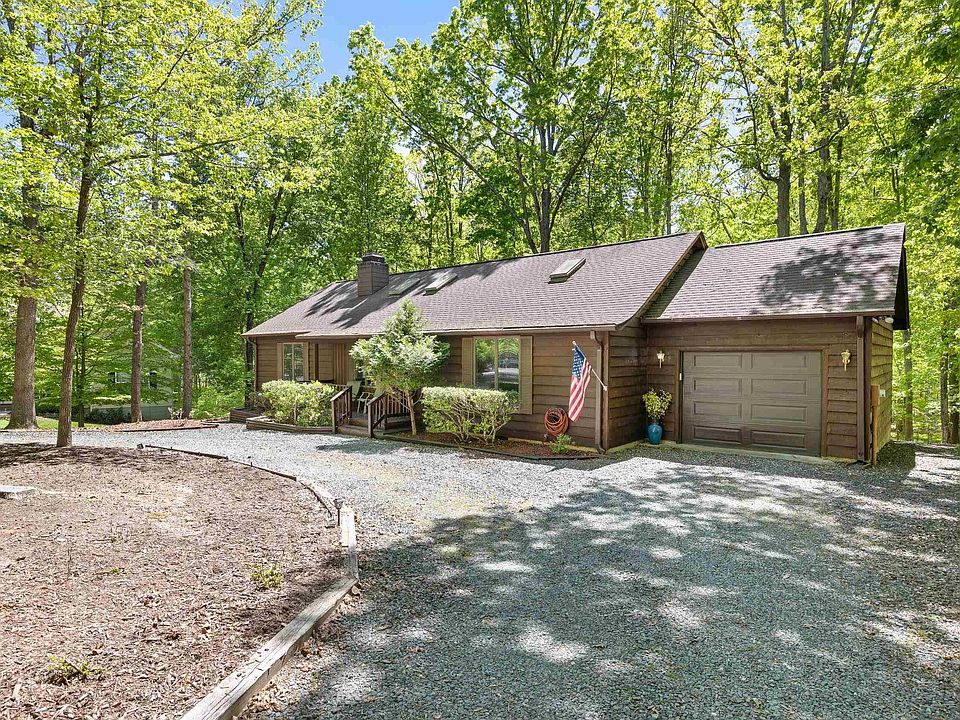 Nestled at the end of a peaceful wooded cul-de-sac in Lake Monticello’s desirable golf course section, this charming ranch-style home offers easy one-level living and a thoughtfully designed layout. A new roof installed in 2020 and new fixtures and finishes complete this lovely home. Step inside to a large foyer with a walk-in closet, leading to a bright open-concept living space with vaulted ceilings, two skylights, and a cozy wood-burning fireplace. The spacious kitchen and dining room feature white cabinetry, ample counter space, a sunny breakfast nook, and greenhouse window perfect for your plants and herb garden. Enjoy the convenience of a large laundry room just off the kitchen and garage. The popular split-bedroom design provides privacy, with spacious bedrooms, each with ceiling fans. The primary bedroom suite boasts a vaulted ceiling, walk-in closet, and a beautifully remodeled bathroom with granite counters. A remodeled guest bath includes a walk-in shower with a glass door and transom window. Relax in the spacious sunroom or on the private deck overlooking the serene half-acre lot. Front porch is perfect for morning coffee and circular driveway making it a breeze coming and going from this charming property. A must see!