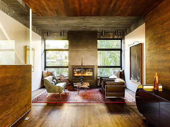 The interior design embraces clean lines and a warm, organic palette. Seven-inch wide plank white oak floors in a custom fumed chocolate finish run throughout the home. Board-formed concrete ceilings subtly reveal the grain of the wooden planks that shaped them—a tactile nod to Williamsburg’s industrial past. Wood, steel, and concrete flow between indoor and outdoor spaces, a unifying theme across Wythe Lane. The exterior is equally considered, clad in water-struck coal-fired brick, gunmetal-gray stainless steel, and exposed concrete, punctuated by the development’s signature verdant trellises.