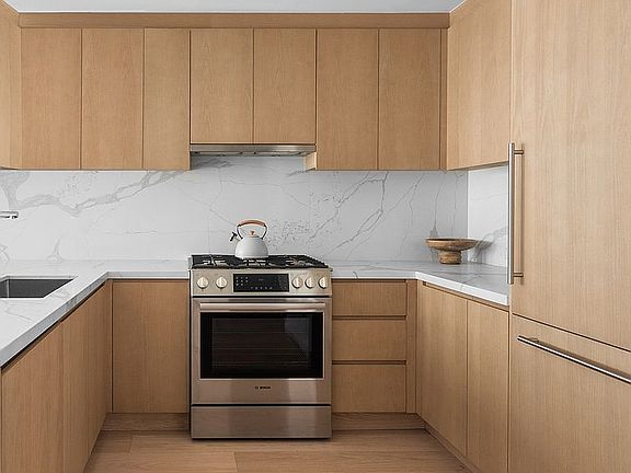 A thoughtful open-concept layout is anchored by wide, 8-inch oak plank flooring and enhanced by a smart climate system, Latch keyless entry, and an in-unit washer and dryer for effortless modern comfort. The top-of-the-line custom German kitchen is both sleek and functional, equipped with integrated Bloomberg appliances, quartz countertops and backsplashes, Grohe fixtures, and soft-close wood cabinetry and drawers. The spa-like bathroom blends timeless materials with contemporary style, showcasing Bardiglio Versilis marble, a custom oak vanity, Duravit floating toilet, and polished chrome fixtures by Grohe, Toto, and Hansgrohe.