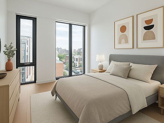 Floor-to-ceiling triple-pane windows let in an abundance of natural light while keeping interiors quiet and temperature-stable. Wide plank oak floors run throughout an open-concept floorplan that maximizes square footage. Solid core doors feature smart lock hardware, and Nest-controlled heating and cooling offers precision temperature control and optimizes energy efficiency. The balcony is perfect for urban gardening, sun lounging, and entertaining. There is also a convenient in-unit washer/dryer.