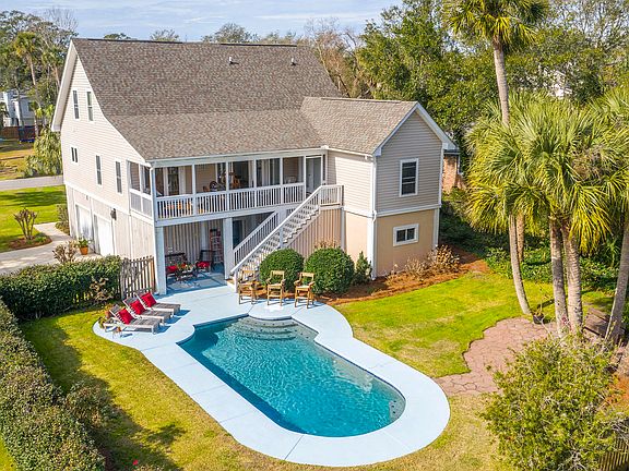 Beautiful elevated island home with an in-ground saltwater pool, open floor plan and wonderful outdoor living space. Located on a large corner lot, only a short walk to the beach and the Isle of Palms Recreation Center. This spacious home is perfect for a vacation get away or spending time with family and friends. This gorgeous home has a large kitchen with Bird's eye Maple Cabinets, Maple wood flooring, and high ceilings. Master bedroom and second guest room are conveniently located on the first floor. Two more large bedrooms and a bonus sitting area are located on the second floor. Elevated area under home features a two car garage, hot water shower, and wonderful space for storage, workouts and fun. Backyard has a 15,500 gallon in ground Gunite pool with booster pump and Polaris automatic cleaning system. Extra off street parking area large enough for a boat or RV. This home is complete with a large porch overlooking a private backyard and pool perfect for having morning coffee or evening wine while enjoying ocean breezes. Relax while sitting around the fireplace or take a short walk to the beach, this is true island living.