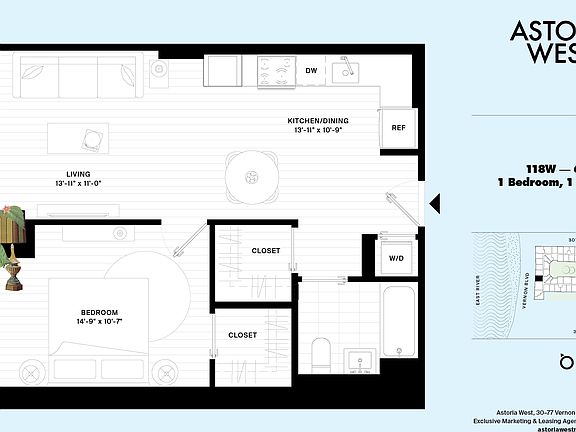 Welcome to Astoria West. Uniquely positioned on the Astoria, Queens beachfront is Astoria West: 534 residences designed by the award-winning architecture firm Fogarty Finger just one and a half blocks from the NYC East River Ferry dock, and only minutes from Midtown Manhattan. Astoria West consists of luxurious studio, one-, two- and three-bedroom homes that enjoy scenic views of the East River, charming Astoria row houses, the iconic Long Island City and Manhattan skylines, as well as tranquil views of the building's very own private courtyard garden.
