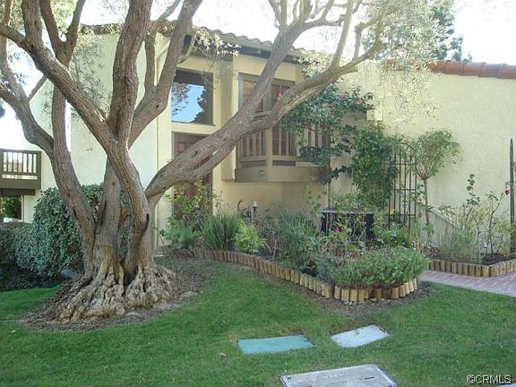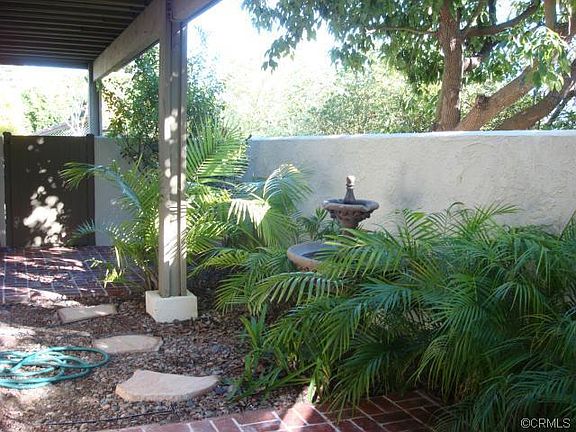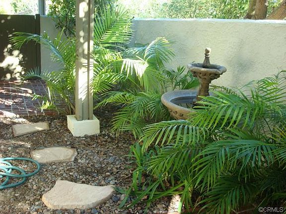 Stunning "The Terraces" end unit lies directly adjacent to the green belt with a wrap-around patio; gives a single family home feel within a gated community. With 3 bedrooms and huge den, this house has park-like view from both levels, smooth vaulted ceilings, recessed lighting, crown moldings, plantation shutters, and newer drapes. The living room displays a romantic fireplace with mantel, raised marble hearth, and built-in shelving. Spacious master bedroom has 2 walk-in closets. Adjacent bedroom opens to lovely private rear yard with a fountain. Gleaming hardwood floors throughout the house, and also has a newer heating system, air-conditioning unit, double pane window and water heater. Within walking distance to award-winning Ridgecrest Middle School.