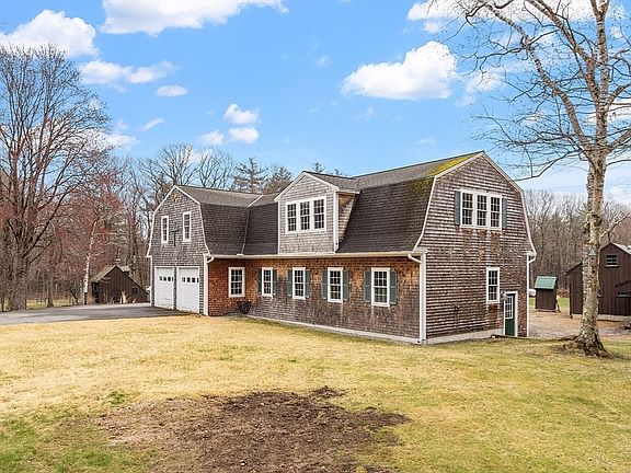 Discover this charming Shingle-style retreat on 9+ acres with an adorable single family home featuring an enclosed porch, top-of- the-line Viessmann heating system, central vacuum and generator hook-up. The back deck overlooks your own private pond. The Sunova solar panels enhance energy efficiency. A standout feature is the 4,000 sq. foot, five-car, two-story heated garage—complete with a Viesmann heating system, radiant heat, a car lift, full bath, a compressor, workshop & its own 2 bedroom septic system. The spacious, heated & mostly finished 2nd floor offers potential for an ADU. Enjoy the beautiful lot that has irrigation, a horse barn with two stalls PLUS an additional level building lot—ideal for expansion or investment. Located at the end of a dead-end road, this property offers serious functionality—perfect for hobbyists, car enthusiasts, contractors or those seeking a mini homestead retreat. Schedule your private showing for this stunning property. * A Must See Homestead *