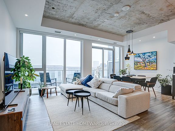 Experience the Luxury You Deserve!This truly spacious, fully furnished designer condo is located in the heart of Riverside. With 2 bedrooms, 2 bathrooms, and a balcony that spans the full length of the condo, this is a unique and exceptional living space. Youll need to see it in person to fully appreciate its charm and functionality.The suite comes complete with parking and a storage locker for your convenience.The primary suite is generously sized, offering ample space for a king-sized bed. It also features a 3-piece en-suite bath with a glass shower enclosure and a large walk-in closet. Step out onto the expansive balcony to enjoy breathtaking sunsets and sweeping views of the CN Tower and the Toronto skyline.The open-concept floor plan is designed to maximize every inch of space, with a stylish eat-in kitchen island featuring quartz countertops, hidden appliances, and plenty of room for both living and dining areas.As part of Riverside Square, residents have access to a stunning rooftop pool with panoramic skyline views, a 24-hour concierge, and a well-equipped gym.Located in Toronto's dynamic Downtown East, this condo offers the perfect blend of urban convenience and vibrant neighborhood life. Enjoy walking to nearby attractions or hop on the Queen Streetcar right outside your door. In just 15 minutes, you can be downtown or on the DVP in a minute. With easy access to the Distillery District, Financial District, The Beach, and countless other city attractions, the location cant be beat.Best of all, you only need to bring your clothes! 24 h notice
