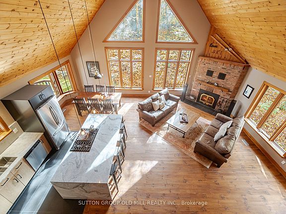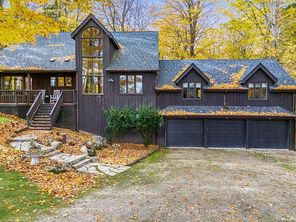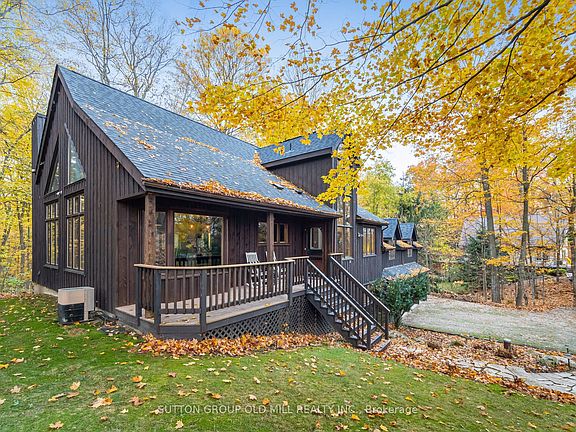 Your Private Forest Retreat Awaits! Nestled among towering hardwoods on a quiet cul-de-sac in an exclusive estate subdivision, this stunning 4,200 sq. ft. multi-level contemporary chalet offers the perfect balance of nature, luxury, and comfort. Just minutes from Mansfield Ski Club and the Mansfield Outdoor Centre, this spacious retreat is designed for family fun and year-round enjoyment. Step inside the classic open-concept A-frame great room, featuring cathedral ceilings, a 30' x 20' living space with a cozy fireplace, and expansive windows that frame enchanting forest views. The chef's kitchen boasts a center island with breakfast bar, built-in appliances, ceramic floors, and warm pine cabinetry, creating an inviting space for entertaining and everyday living. There's truly something for everyone here - gather for movie nights in one of two family rooms, unwind in the outdoor hot tub or sauna, enjoy friendly competition at the horseshoe pit or cozy up by the fire pit under the stars. The property also features a 6-car, 3-bay garage with a drive-through bay, a large workshop/boot room, and parking for 10+ vehicles. With propane cooktop and BBQ hook-up, wood stove, and propane stove, this home blends rustic charm with modern convenience. Whether you're hosting a crowd or enjoying a peaceful weekend escape, this home offers breathtaking forest views from every room and an unparalleled sense of privacy. Only one hour from Toronto, yet a world away from the ordinary - discover your family's next chapter in this extraordinary Mansfield retreat!