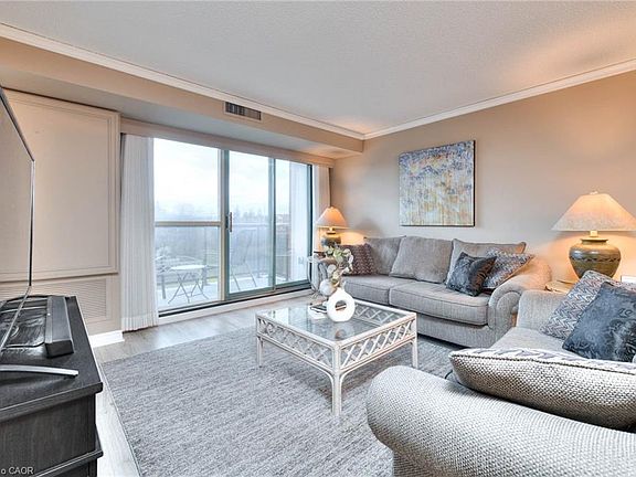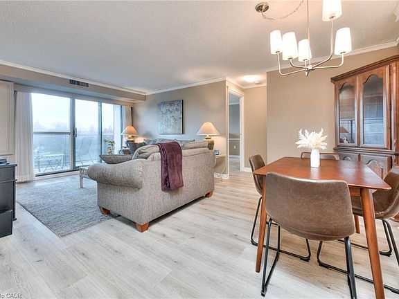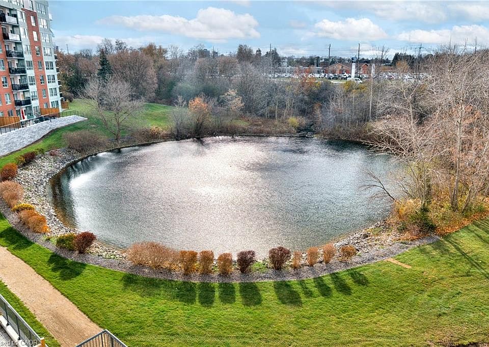 This bright and inviting end unit condo features a desirable split-bedroom layout — with a bedroom and full bath on either side, offering comfort and privacy for family or guests. Meticulously painted with a warm neutral, upgraded with a durable wide plank flooring, tasteful lighting, and crown moldings. The bathrooms have a classic terracotta aesthetic with handy grab bars for stability. The kitchen is perfectly positioned to capture a spectacular view of the ponds, while the spacious living room and dining room opens onto a private balcony with a modern glass railing overlooking the serene setting with views of both ponds with cascading waterfalls highlighted by up lighting at dusk, a lovely place to watch for the birds and enjoy the sunsets. The primary bedroom features his-and-hers closets and a full ensuite bath, creating a peaceful retreat. The in-suite laundry is tucked neatly away in its own room. Enjoy carefree condo living with two parking spaces — one underground and one surface — plus a storage locker for added convenience. The building is known for its excellent management and warm community atmosphere, offering secure entry, an on-site superintendent, a cozy library, a party room, rooftop and ground-level BBQ areas, and a guest suite for visitors. Located in north Waterloo, you’ll love the easy access to bus routes, the LRT, the expressway, and Conestoga Mall — plus walking and biking trails just outside your door. Comfort, convenience, and natural beauty await at Blue Springs.