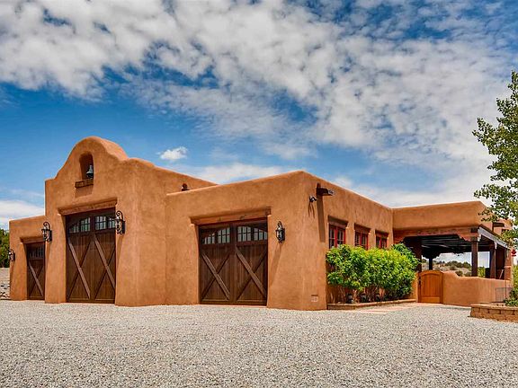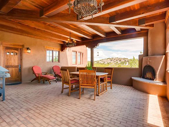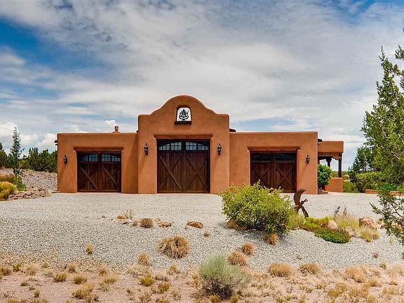 A beautifully appointed gracious home situated in the rolling hills of Turquoise Trails in Santa Fe, a lovely quiet place to rest your heart and soul. The Main house has a gracious entry portal with views of the Santa Fe basin and over 3000 sqft of living area. The kitchen is the heart of the home with top of the line appliances. There are Coved ceilings in the Living room and bedroom. The master bath is lavishly appointed and includes a hot water warming towel rack. The windows throughout the home offer huge sweeping views of the surrounding foothills and mountains. This one of a kind property has a 650 sqft Theater which seats 10 with a whimsical box office. It features a beautiful wood ceiling treatment and Stars that will leave you in awe! The beautiful built in bar in the theater includes an icemaker and refrigerator. The 2 story studio/guesthouse/RV Storage has unlimited potential, just use your imagination! It could be an artist studio or you could make it a recording studio, really it's just up to your imagination. It includes living area, kitchen, office and bathroom. The upstairs living area overlooks the 16'x48' studio which includes 50 amp power and a 14' electric roll up door. A rooftop observation deck offers 360 degree views & down below the wraparound portal offers breathtaking views. The hot tub and Sauna overlooks the property and there is RV parking with 50 amp service, over $2 million invested.