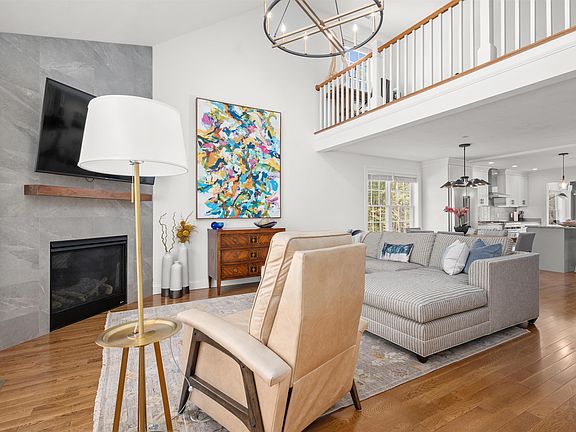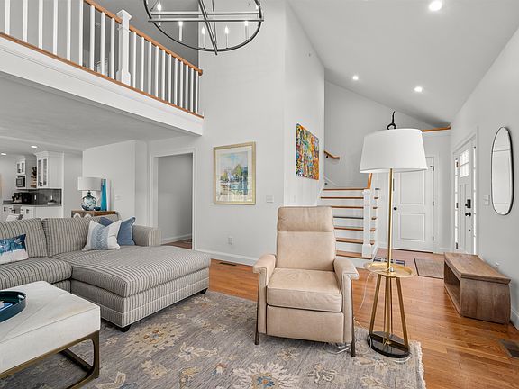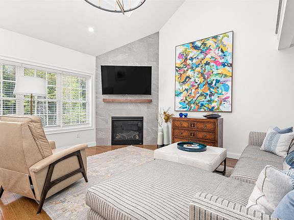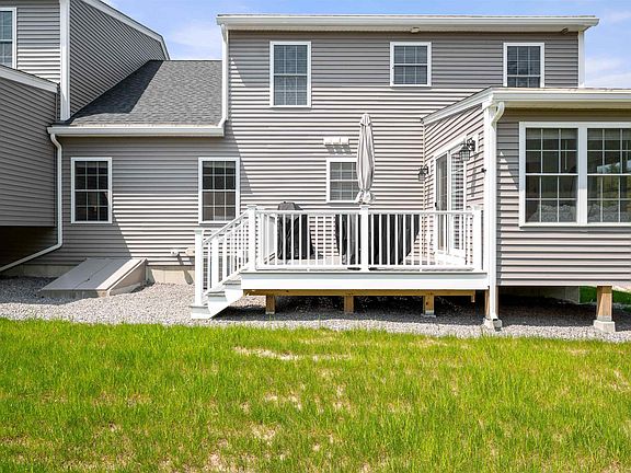 This new, seldom used, highly upgraded end unit abutting the woods, is a must see. Sitting on one of the premium lots, As you walk in you will immediately see the beautiful custom gas fireplace with floor to ceiling tile and a solid maple mantel. You will love the open floor plan, natural light, cathedral ceiling, and the hardwood floors throughout the entire home, with tile in the baths. The custom kitchen boasts high end Thermadore appliances including a Dual Fuel Range, upgraded tile backsplash, and under counter lighting. To the right of the kitchen island is a custom designed expanded kitchen with coffee bar, wine cooler and additional cabinet space. On the main floor you will also find the primary owners suite with walk-in closet, custom bath with double sinks, tiled shower, and soaking tub. Just outside the bdrm door is the laundry room with matching cabinets, and shelving. To complete the 1st floor, there is a great sunroom with windows all around, an iron gas stove for those cozy winter days, and sliders leading onto the nice deck. Upstairs is the 2nd bdrm, a den, and a bonus room for plenty of additional guest space. There is a 3/4 bath with custom tile shower and fixtures, and office or sitting space on the landing area overlooking the living room with a large end window that has a view of the woods and some mountain tops giving you plenty of natural light. The full unfinished basement has been plumbed for a bath & shower. The quality upgrades are a must see!!