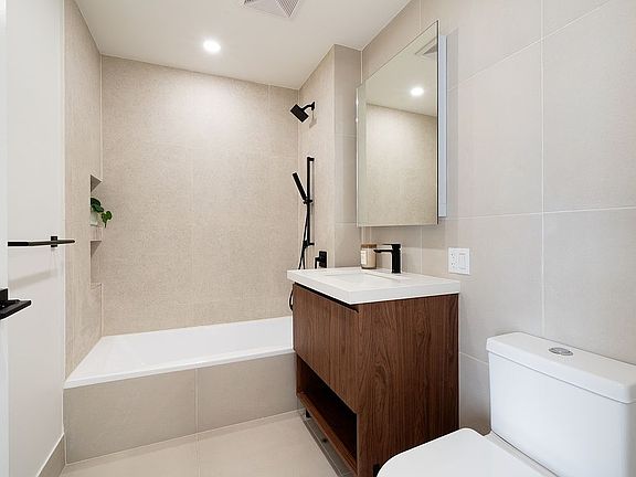 The luxurious bathroom is designed as a private sanctuary, boasting a modern wood vanity, sleek black Moen fixtures and a contemporary lighted mirror. The spacious bedroom features large sunny windows and a large closet.