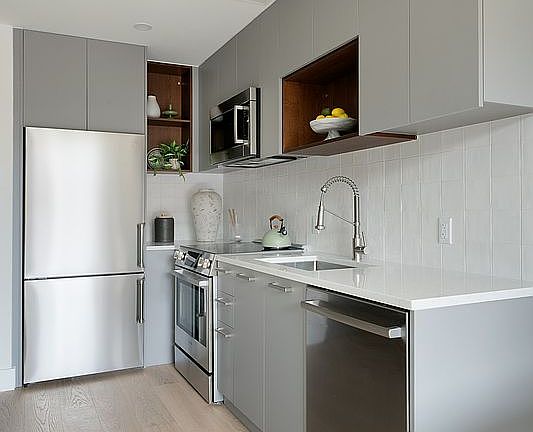 Residence 4A's 1 bedroom, 1 bathroom layout exemplifies the pinnacle of luxury living. The interiors are adorned with rich white oak engineered wood floors, creating a warm and inviting atmosphere. The spacious and open floor plan allows for effortless entertaining and comfortable living leading out to a private balcony. The state-of-the-art kitchen is a chef's dream, featuring sleek white countertops and a blend of custom painted wood shaker cabinetry and elegant open shelving that enhance the clean, modern aesthetic. High-end appliances by Bosch ensure every meal is prepared to perfection.