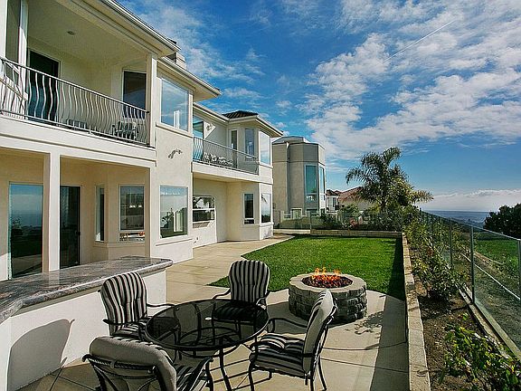 Custom home located in the gated Sea Ridge Estates, with panoramic ocean and hills views from downstairs and upstairs. A total of 4 fireplaces: Livingroom, familyroom, game room, and Master Suite. Gourmet kitchen has granite counters, large island, blt-in appliances plumbed for gas and electric. Dining room,dinette, breakfast bar, walk-in pantry and butler pantry. First floor also has a library & full bath, family room with powder room, utility room includes floor tub and clothes chute. 5 car garage includes cabinets, workroom with sink and bath. Game room with under counter refrigerator, balcony, video game room, powder room, multipurpose room, 4 bedrooms with walk-in closets and full baths and Master Suite are on the second floor. Master Suite has private balcony, add''l closet, with nook. Master bath has a jacuzzi tub, walk-in shower with dual shower heads, double sink vanity and make-up area. Toilet and bidet are together in separate room. Wall switch near bed for romantic nights to turn on fireplace. Multipurpose room has been used for office, computer room, tv, exercise room, study. Back yard has Viking grill, gas fire pit, patio, grass area for Buyer to develop. Nearby walking trail, golf course, San Clemente beaches, AmTrack, outlet stores, restaurants, and grocery stores.