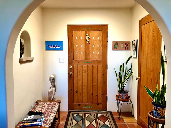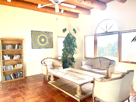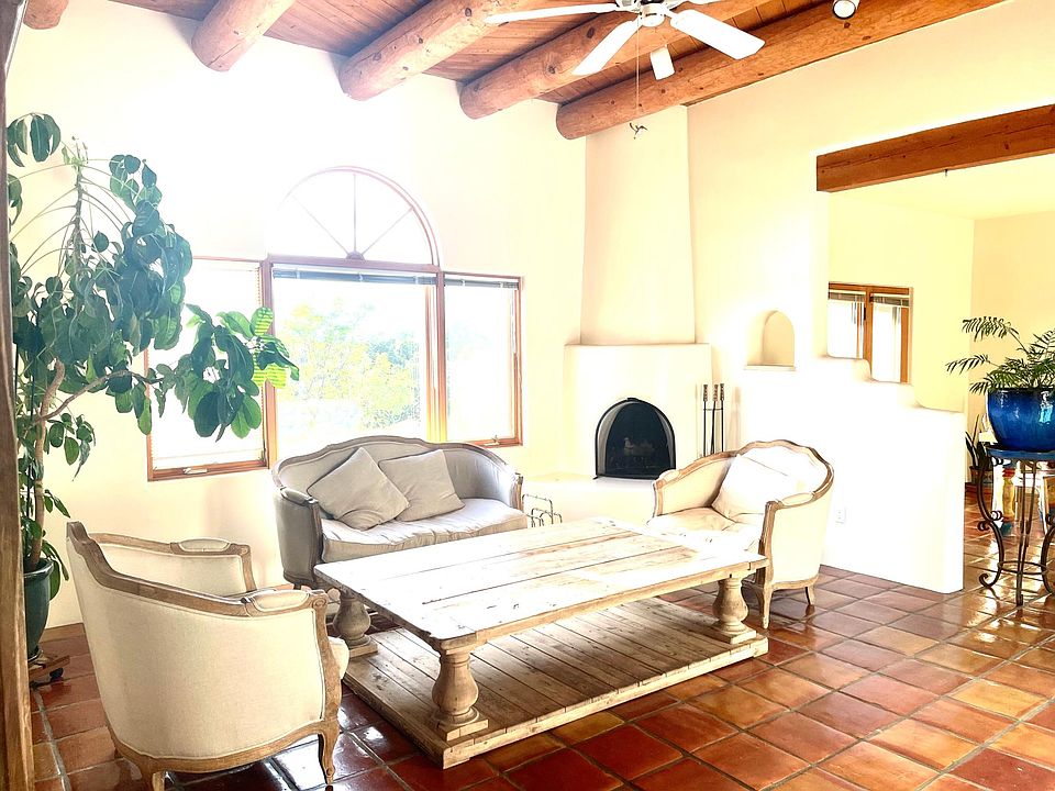 Gorgeous gem in the best part of Eldorado, close to all amenities and a short walk to the paved bike path. Nestled in privacy, set high on over 2 acres of wonderfully landscaped grounds, with amazing views of the mountains from every room. This pristine, light and airy 3 bed 2 bath home offers a bonus 4th room with its own entrance and wood burning fireplace. Pristine Saltillo tiles throughout, with new carpet in the bedrooms. Spacious living room with kiva fireplace and separate dining area, open plan kitchen with big pantry and breakfast nook, brand new, top of the line stainless steel appliances, large back portal with tranquil views of the Jemez range and breathtaking sunsets. Radiant heating throughout (natural gas), separate 2 car garage, walled front garden and lots of space to feel free and roam around. This is a rare find in Eldorado, clean and immaculate, private and close to everything! Santa Fe details throughout. Santa Fe living at its best! Eldorado offers wonderful amenities, from tennis courts, large swimming pool and an extensive network of paved bike paths, to grocery store, hardware store, coffee shops, restaurants and a cozy tap room with a real community feel. An award winning school sits at the heart of this sought after neighborhood. An ideal place to live, surrounded by wildlife, and only 15 minutes to everything that Santa Fe has to offer. Min. 1 year (longer leases preferred). Must have excellent credit, a stable income and good references.