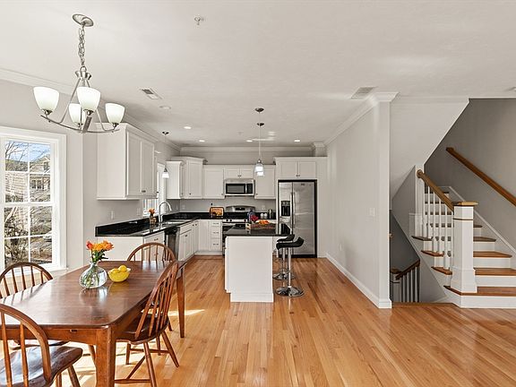 Neatly tucked away, this beautifully designed east-facing end-unit townhouse is filled with natural light. The private entry features a double closet, access to the one-car garage, a laundry room, and a hallway leading to the family room with walk-out access to the rear. The open-concept main level includes a spacious kitchen with white cabinets, granite countertops, stainless steel appliances, and an island with seating. A sunlit dining area with bump-out transitions to the living room with fireplace and a convenient half bath. Upstairs, find three bedrooms, a full bath, and a primary suite with large closet and en suite 3/4 bath. The entire home is wired with ethernet for seamless internet connectivity, and a lower-level utility room offers additional storage. Ideally located near major routes, shopping, and dining—this home offers comfort, style, and convenience.