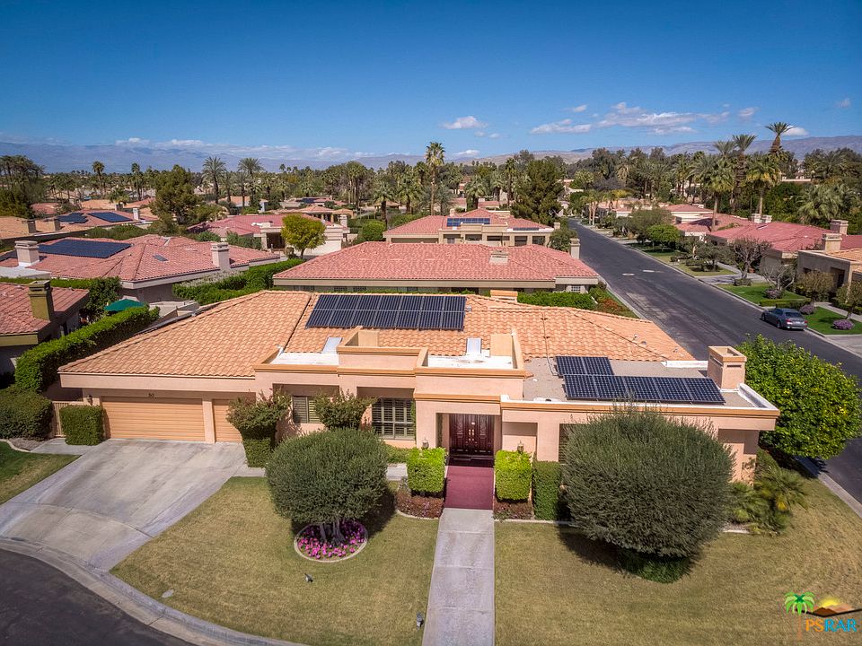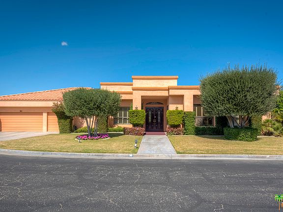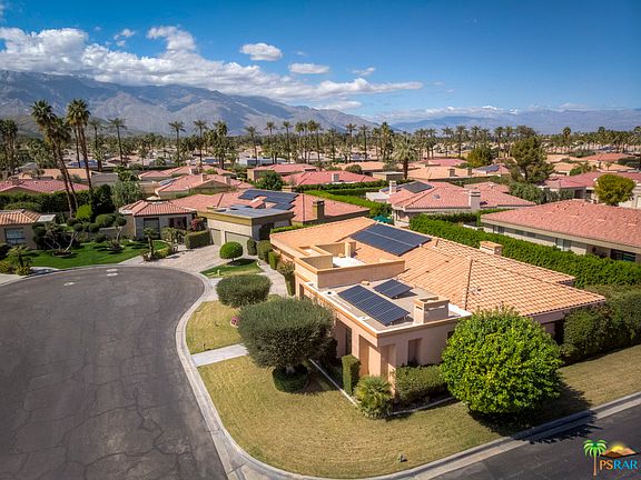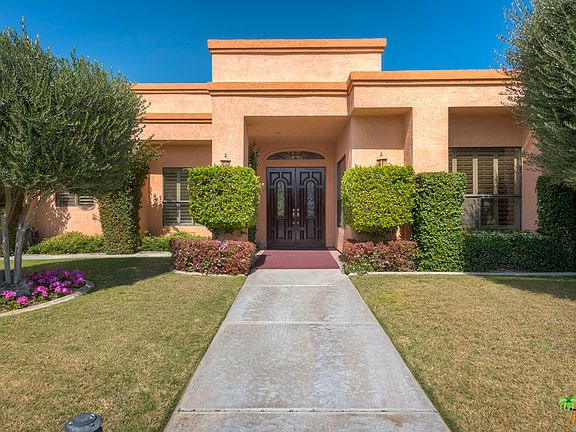 This stunning single family home has many custom features, to include custom leaded-glass entry doors, volume ceilings, plantation shutters, and hardwood floors. The large gourmet kitchen has a center island with a prep sink, a breakfast bar and a banquette. The formal living room is ideal for an art display, as the current owner has done. In fact, this whole home has the space for that art collection you've wanted for so long. The formal living room and spacious master suite both have fireplaces. The 3rd bedroom has built-ins and is now a custom designed library/office/retreat. The backyard is very private and provides a large patio. a salt water pool/spa, mountain views and fruit trees. Other improvements include contemporary fans, leased solar panels (saves approx $1.5K a year on elec bill), an evaporative cooler, custom doors,and ample garage storage. Compare this to other similarly sized homes in Rancho Mirage and you'll realize, this is a buy!