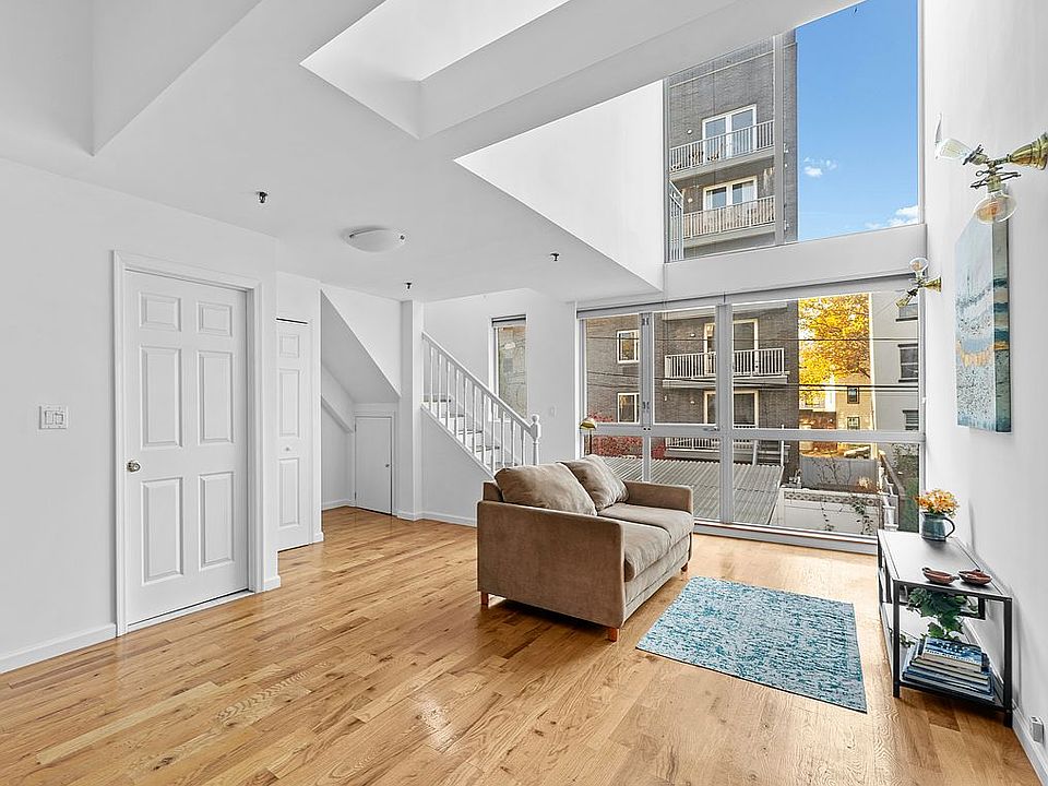 Designed to maximize space and natural light, this home features soaring 17-foot ceilings and oversized windows that fill the apartment with light. The open-concept kitchen is equipped with a center island, oak cabinetry, granite countertops, and high-end stainless steel appliances, including a dishwasher. The spacious living and dining area, with its dramatic wall of windows, offers stunning sky views. Upstairs, the bedroom is a peaceful retreat with access to a private terrace.