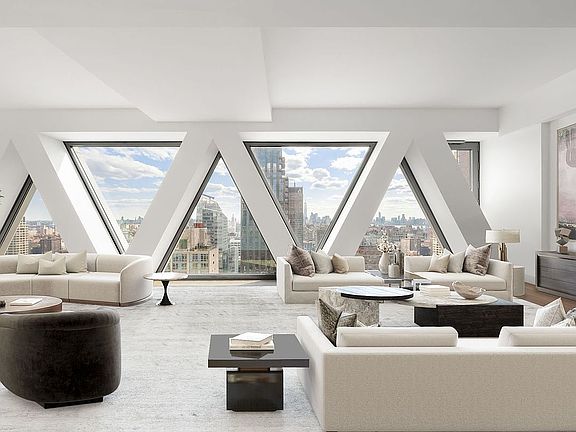 Two equally spacious ensuite bedrooms occupy the south end: one with a dramatic, triangular-windowed bathroom and the other with a marble shower/bathtub and a large walk-in closet. Both bathrooms feature custom-crafted White Oak vanities. Discreet luxuries throughout this home include 7-inch-wide plank, White Oak flooring and multi-zone climate controls. Expertly designed by Morris Adjmi, this home is the product of innovative materials, warm finishes, flowing lines and bright spaces.