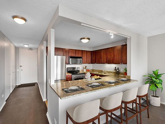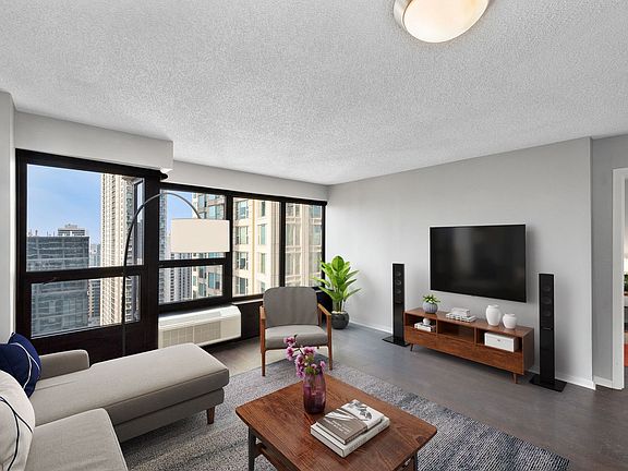 GREAT INVESTOR OPPORTUNITY! Wonderful building and excellent tenant, lease expires 8/31/26, rent is 2,295. Spacious 1 Bedroom in the Heart of River North with Breathtaking City Views! Open Floor Plan Features Hardwood Floors Throughout, Open Kitchen with Large Breakfast Bar, Custom Window Shades Throughout, Newer HVAC Units and TONS of Closet Space. Open Kitchen Features Shaker Style Cabinetry, Stainless Steel Appliances, Granite Counters and Huge Breakfast Bar Open to Living Room for Entertaining. Spacious Living Room with Amazing Sunset City Views. Bedroom Large Enough to Fit a King Sized Bed + an Abundance of Closet Space. Oversized Bathroom with 2 Closets & Shaker Style Vanity with a Ton of Countertop Space! Everything Right Outside Your Front Door Including the Lifetime Fitness at One Chicago & Whole Foods. Everything from The Mag Mile Shopping, to the Best Restaurants in the City & the Lakefront Path. Assessments Include Bulk Cable Package (Over 180 HD Channels), Internet (250MB), Water & Amenities - ELECTRIC IS ONLY OUTSIDE UTILITY. Outstanding Building Amenities Include 24-Hour Doorman, Award Winning 2 Story Sundeck & Outdoor Pool That Was Recently Renovated, Comprehensive Gym, Biz Center, Theater & Party Room. Financially Stable Building that's NEVER had a Special & with No Rental Restrictions! 30 day minimum leases.