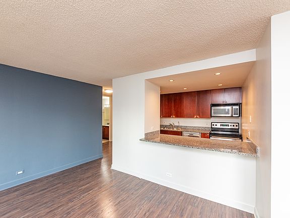 Prime SW corner unit with stunning city views in River North! This condo features hardwood flooring throughout (replaced in 2024), a spacious living room, and a separate dining room. The galley kitchen includes granite counters, a large breakfast bar, cherrywood cabinets, and stainless steel appliances, including a dishwasher and built-in microwave. The bathroom is generously sized with a linen closet and a makeup station. The large primary bedroom offers ample closet space. In-unit laundry. Cable, internet, water, and one garage parking spot are included. Building amenities feature a recently renovated outdoor pool and sundeck with numerous grilling stations and firepits, a fully equipped gym, business center, party room, theater room, dry cleaners, 24-hour door staff, and on-site management. Amazing location with Whole Foods, Trader Joe's, Chicago Red Line, shopping, dining, lake, and Michigan Ave all within a few blocks. Property management company requires a mandatory Resident Benefits Package for an additional $40.00 per month; includes renters insurance, positive credit reporting for on-time rental payments, identity fraud protection, and more.