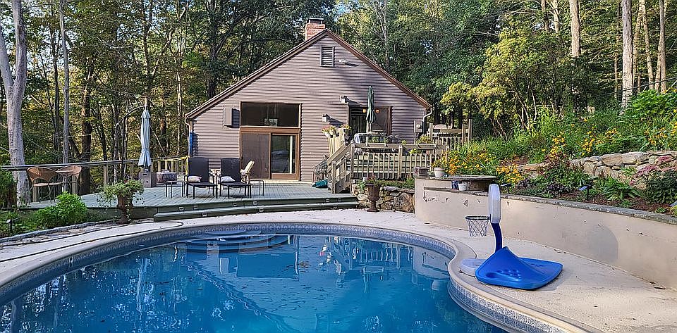 Recently updated 4 bedroom 3 bathroom with a large deck and pool. Complete renovation recently of all interior, exterior, and all systems. Expansive windows with South and Western facing views of a gorgeous natural trout stream and pond on a wooded lot. The Mill River provides an audio experience as you open the windows or relax in the pool. The deck has great views of the woods, streams, and ponds. Great vacation potential with an appeal to every generation. Main floor Master Bedroom and main floor Guest Bedroom. in addition, two additional Bedrooms on bright lower level with views and thier own living room. Surrounded by substantial modern homes deep in wooded settings. In-ground Pool, Hardwood floors, walls of glass, wood shake roof, central air, and an Adirondack setting create a unique space with gorgeous views and light in a wooded setting of relaxing sounds and nature. Keep your kayak on the shoreline of the pond you own. Fish for native brook trout in your own stream.