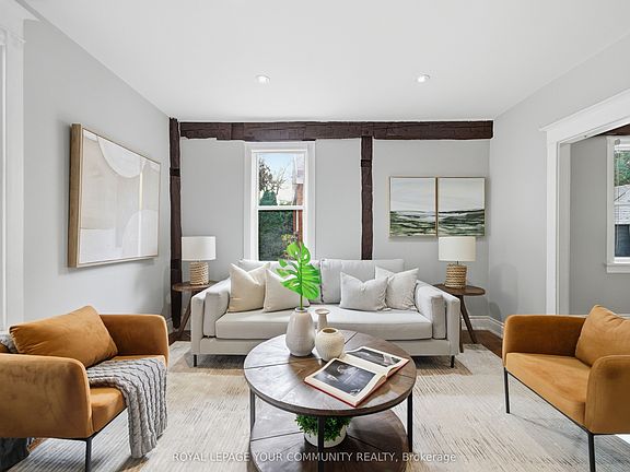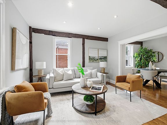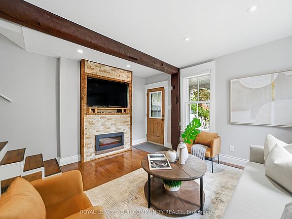Welcome to this enchanting semi-detached home that perfectly blends sophisticated charm with timeless character. Nestled in the highly sought-after Mill Pond community, this residence sits on a rarely offered 153 ft deep lot featuring a fully fenced backyard and a picturesque front porch - ideal for enjoying quiet mornings or evening sunsets. Step inside to a warm and inviting family room exuding comfort and character, highlighted by a large window, pot lights, and a cozy electric fireplace. The space offers a seamless flow from the family room to the dining area, creating an open and connected main floor ideal for both everyday living and entertaining. Throughout the home, century-old hand-hewn beams and refined hardwood floors on the main level add architectural depth and rustic authenticity. The bright, updated kitchen is both functional and stylish featuring a breakfast bar, quartz countertops, ample cabinetry and storage space, a side entrance, and a walk-out to your private backyard retreat with a deck and patio perfect for entertaining, al fresco dining, or simply creating peaceful moments surrounded by nature. A thoughtfully located powder room completes the main level. Upstairs, discover a bright and open second level that offers versatility and charm. The primary bedroom includes a walk-in closet, while the second bedroom provides comfort for family or guests. A sun-filled open area with a window offers the perfect space for a home office or den, combining elegance with functionality. The generously sized main bathroom is impressive and highly functional - a true luxury for daily living. Located just steps from vibrant shops, the Richmond Hill Centre for the Performing Arts, the library, top-rated schools, and scenic Mill Pond walking trails, this home delivers the best of community, character, and convenience making it an ideal choice for families and professionals alike.