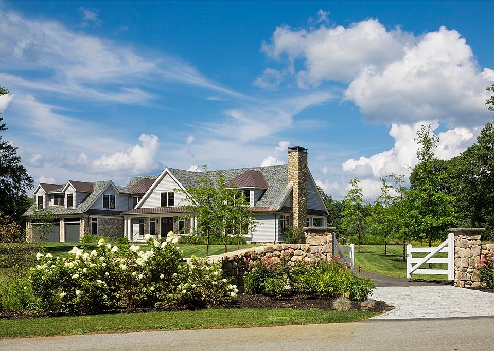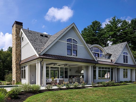 Welcome to Sweet Oaks Farm! Step into this inviting shingle-style farmhouse, where expansive windows frame breathtaking views of pastures and forests. The living room features a soaring double-volume ceiling with exposed wood beams and a striking stone-clad fireplace. Seamlessly blending comfort and entertainment, the home integrates indoor and outdoor living with a covered patio and a summer kitchen. The adjacent gourmet kitchen sets the stage for culinary delights. Upstairs, the luxurious primary suite includes a private deck overlooking the serene landscape. The well-appointed 6-stall barn offers ample space for horse enthusiasts, including spacious turnout areas, outdoor ring and a heated indoor arena, with a full apartment above. Just 20 miles from Boston, Sweet Oaks Farm provides a peaceful retreat in a picturesque setting, promising tranquility and luxury.
