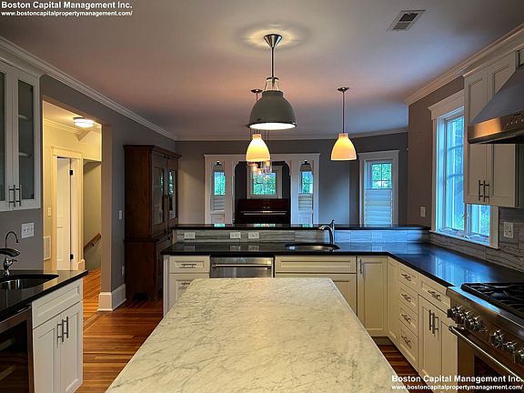 **AVAILABLE NOW** RARE SINGLE FAMILY**SHORT TERM & FLEXIBLE LEASE OPTIONS** home on a quiet tree-lined street minutes from Davis Square, Somerville community path, and the Ball Sq. Green Line Extension. Renovated from the studs in 2015, 4 floors of expansive living space include 4 bedrooms, 4.5 baths and a glorious primary suite with a giant walk-in closet, en-suite bath, and attached sun porch/office. A spectacular chef's kitchen with marble island, granite counters, closet pantry, and Thermador appliances opens up to a private deck for indoor/outdoor dining. Gather by the cozy gas fireplace in the living room or in the finished basement family room with wet bar. Work from home in multiple flexible spaces throughout. Sunlight pours through stained glass and new windows (with custom Hunter Douglas shades) onto glowing wood floors. Three porches, lovely front yard garden, gated backyard, driveway with room for 4 cars, and detached 2 car garage complete this urban oasis.