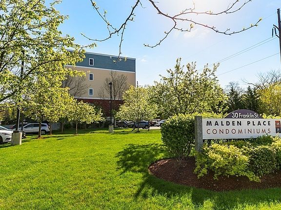 One of the largest units at Malden Place available for sale now! Unit 112 has 1667 sq ft on 2 levels of living space with 2 entrances, 3 Bedrooms, 3 full bathrooms and 3 deeded parking spaces. Main level has open concept kitchen-dining area-living room,1 shared full bath and 2 bedrooms, one of which is a Master Bedroom with walk-in closet and Master Bath. Lower Level is above ground with 2 distinctive areas are set up as sleeping area with full bathroom with jacuzzi & shower and bonus space to be used as needed (office, Den, family room) and a door out to the parking lot. Central Air, hardwood floors throughout, new Quartz countertops in the kitchen and bathrooms, freshly painted throughout. The building is abutting the popular "Bike to the Sea" Trail- a great convenience for bikers, joggers etc and located in .8 miles to Malden Center T Station. Complex offers a nice Gym, clubroom to use for private events & large storage area. Well run association with on-site professional management