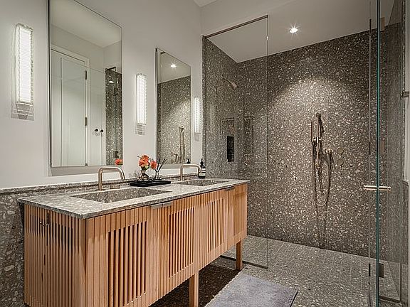 The primary bedroom is complemented by dual closets. The primary bathroom is also accessible from the main living area and features Agglo Ceppo honed stone walls, flooring and countertops, and a custom-slatted white maple double vanity with satin nickel cabinetry pulls, deck-mounted faucet and oak controls. A discreetly located closet featuring LG washer & dryer completes this exceptional offering.