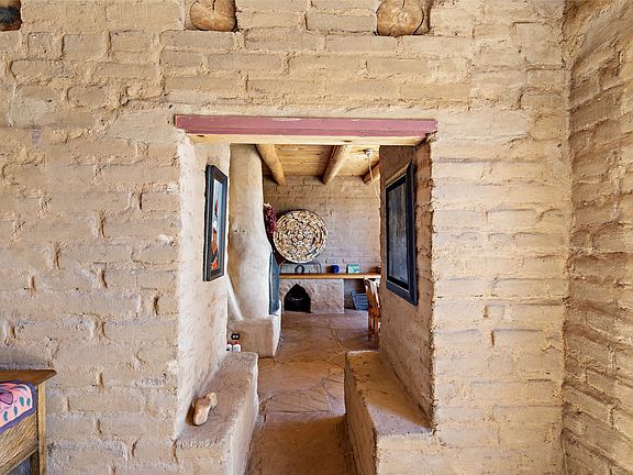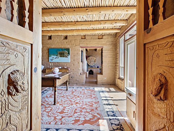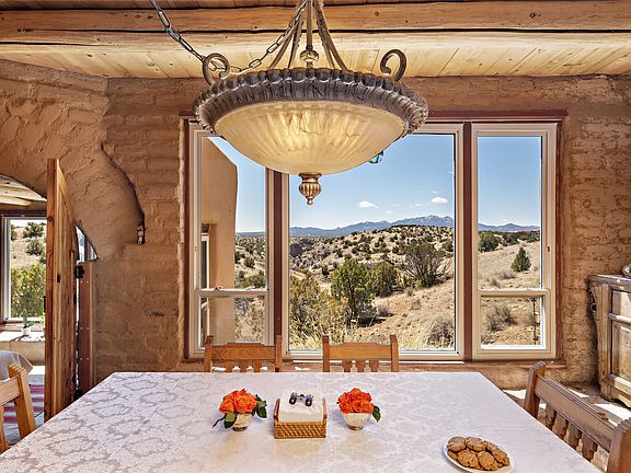 Escape the fast-paced world and find your artistic haven in this tranquil retreat. This stunning two-bedroom, two-bathroom Passive Solar home boasts exquisite features such as exposed adobe brick walls, a hand-carved door, stone flooring, and an open kitchen/dining room that flows effortlessly into a courtyard. Cozy up to one of the four Kiva fireplaces and take in breathtaking views of crimson, amber, lavender, and rose sunrises and sunsets. The living room, dining room, entry, and one of the bedrooms offer dramatic canyon views where you can observe wildlife and changing seasons, or take long walks in nature. This home is nestled in Rancho Alegre, once a movie set for iconic films like Butch Cassidy and the Sundance Kid and the Magnificent Seven. Experience the magic for yourself and schedule a viewing today.