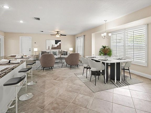Updated and truly move-in ready. This well taken care of home has 3 bedrooms, all with walk-in closets. The two bathrooms are generous in size, one with a remodeled shower and the other with a nice tub. Both bathrooms have updated vanities and granite tops. The kitchen is modern with stainless steel appliances, shaker white cabinets, and a large island that can easily seat 5 or 6 people. The counters again are granite. Huge lanai with tropical views and an avocado tree. The owners left the avocado picker for the new homeowner. An oversized two-car garage rounds out the picture. Pet friendly, up to two pets, 35lbs. or less. Fees ($315 per month) include water inside and out, and I can assure you that is a big bonus. Fees also include cable and lawn care. No need to buy a lawn mower. A long-lasting Tile Roof was installed in 2012. Shutters are provided throughout the home. Located near lots of shopping and restuarants. Bike to the popular pickleball park or Sugden Park for excerise and concerts.