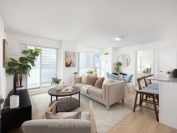 Stunning southwest-facing corner unit at the sought-after Legacy Condos! This 2 bed + den, 2 bath suite offers almost 900 sq.ft of bright, open-concept living space plus a spacious 250 sq.ft wrap-around balcony with breathtaking CN Tower and skyline views. Impeccably maintained, featuring modern finishes, a large kitchen w/ a large granite island, ensuite laundry, and floor-to-ceiling windows that flood the unit with natural light. Just steps to TTC, Fairview Mall, parks, and schools, with quick access to 401/404/DVP. Exceptional building amenities include an indoor pool, gym, yoga room, cyber lounge, party room, and more. Parking and locker included!