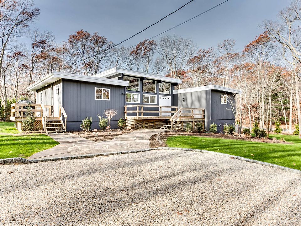 Rental Registration #: 25-1072 Charming and renovated mid-century contemporary home on lovely landscaped .6 acre property less than one half mile to Gardners Bay, and association access to Three Mile Harbor is available for year round rental and offered on an unfurnished basis. This home features a dramatic living/dining room with brick fireplace, 18 foot ceiling height, clerestory windows, kitchen with gas cook oven, expansive deck along rear of house, spacious master bedroom en suite plus two guest bedrooms and full bath. Beautiful white washed hardwood floors throughout, freshly painted, new central air conditioning, updated windows, lovely professionally designed landscaping. Ready for you to totally personalize and make this your home.